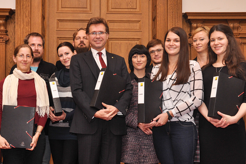 Der "Tag der Lehre" ist traditionell auch jener Tag, an dem neue Lehrende an der Universität Graz begrüßt werden. Der Vizerektor für Studium und Lehre Martin Polaschek überreichte den MitarbeiterInnen eine Willkommensbox mit den wichtigsten Unterlagen für den Start und bedankte sich für die künftige Zusammenarbeit. Insgesamt waren neun Personen zu deinem kleinen Empfang gekommen.